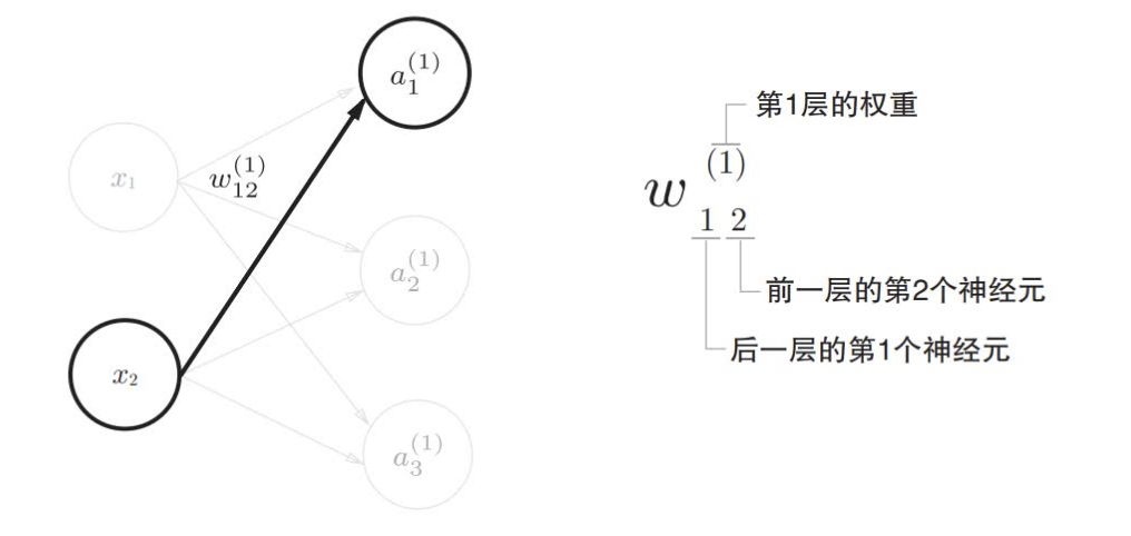 首先导入符号$w_{12}^{(1)}$, $a_{1}^{(1)}$等,如下图,权重和隐藏层的神经元右上角有一个"(1)",它表示权重和神经元的层号,此外,权重右下角的两个数字,它们是后一层的神经元和前一层的神经元的索引号,比如$w_{12}^{(1)}$表示前一层的第二个神经元$x_2$到后一层的第1个神经元$a_{1}^{(1)}$的权重。权重右下角按照"后一层的索引号、前一层的索引号"的顺序排序