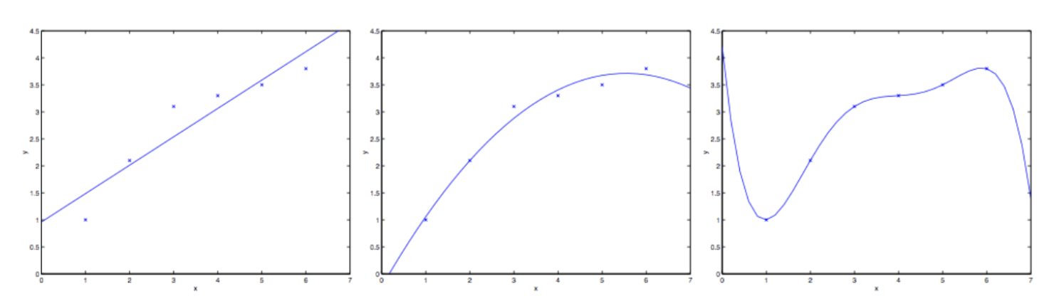 那要是我们添加一个二次项,用 $y=\theta_0 + \theta_1x + \theta_2x^2$来拟合(上面中间的图),明显如果我们对特征补充得越多,效果就越好。不过增加太多的特征也会造成危险,看第三张图就是拟合5项多项式$y=\sum_{j=0}^{5}\theta_jx^j$的结果,可以看到,虽然拟合曲线完美地通过了所有当前数据集中的数据,但我们明显不能认为这个曲线是一个合适的预测工具,比如针对不同的居住面积 $x$ 来预测房屋价格 $y$ ,左边的图是一个欠拟合的例子,明显看到漏掉了数据集中的结构信息,而最右边的图是过拟合的例子