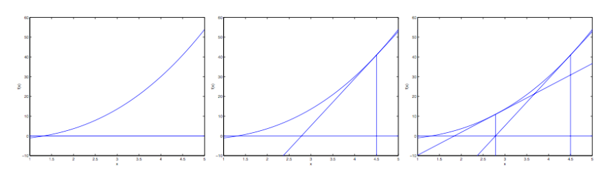 在最左边的图中,我们可以看到函数 $f$ 就是沿着 $y = 0$ 的一条直线。这时候是想要找一个 $\theta$ 来让函数值等于0,这时候发现这个 $\theta$ 值大概在1.3左右。假设我们设定初始值$\theta=4.5$。牛顿法就是在$\theta=4.5$的地方画一条切线(中间的图,这样就给出了下一个 $\theta$ 猜测值的地方,也就是这个切线的零点,大概是2.8。最右面的图中是再次进行一次这样的迭代后的结果,这时候的 $\theta$ 大概为1.8。这样多次迭代过后,很快就能接近 $\theta=1.3$