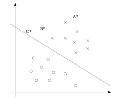 注意到A点离决策边界很远。如果我们被要求在A处对 $y$ 的值进行预测,那么我们应该非常确信 $y = 1$。相反,C点非常接近决策边界,虽然它位于我们预测 $y = 1$ 的决策边界的一侧,但似乎只是对决策边界的一个小变化很容易导致我们的预测改变为 $y = 0$。因此,我们对A处的预测比对C的预测更有信心。B点位于这两种情况之间,更广泛地说,我们看到如果一点远离分离超平面,那么我们对预测可能会更有信心。