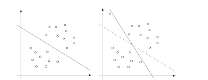 到目前为止所呈现的 SVM 的推导都是假设数据是线性可分的。虽然通过将数据映射到高维特征空间通常会增加数据可分的可能性,但我们无法保证它始终如此。此外,在某些情况下,我们并不希望找到分离超平面是我们想要的,因为这可能容易受到异常值的影响。例如,下图左边显示了一个最佳间隔分类器,当在左上角区域(右图)中添加了一个异常值时,它会使决策边界产生戏剧性的移动,并且得到的分类器的间隔小得多。