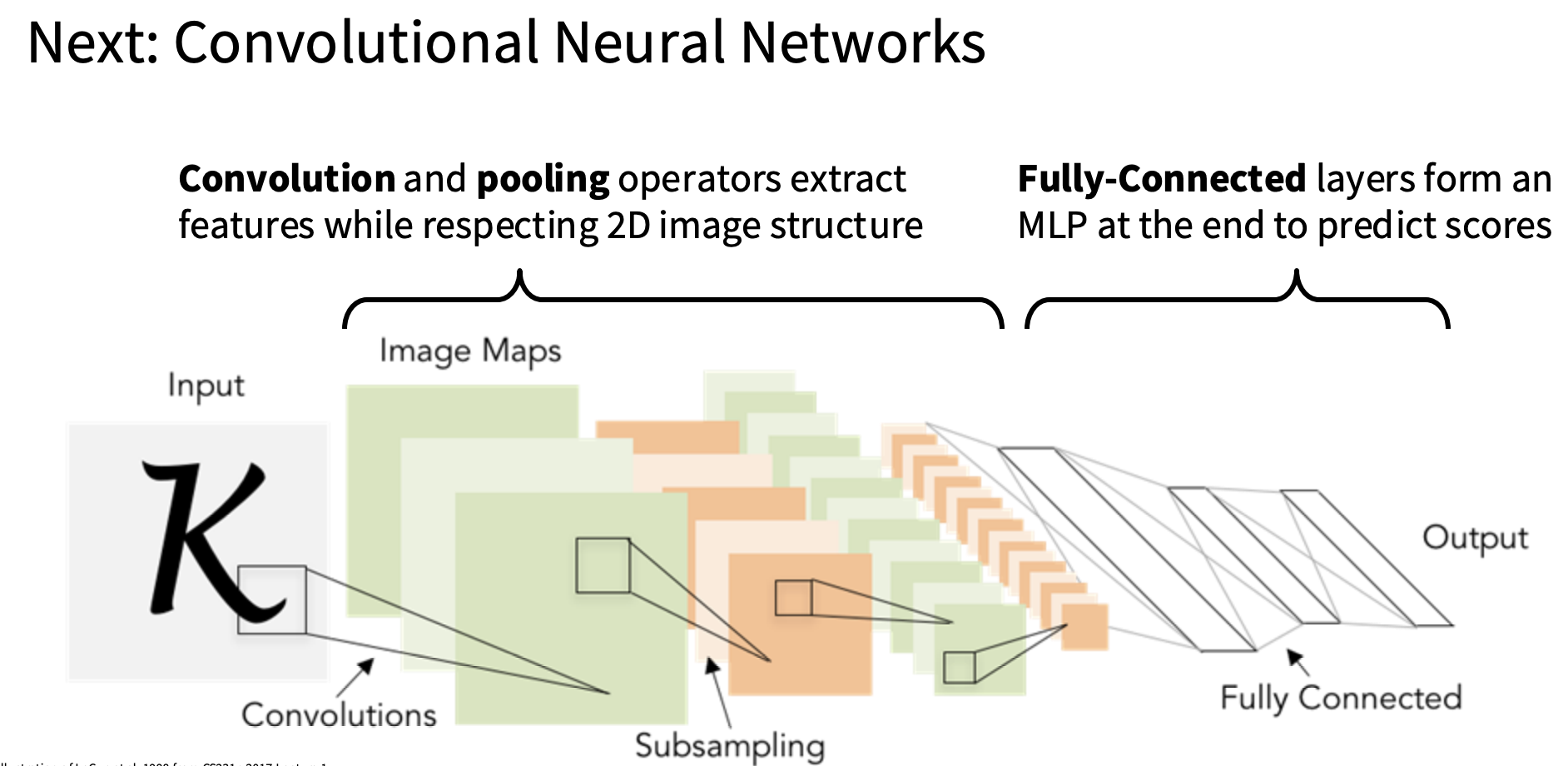 这就引出了卷积神经网络,所以卷积神经网络基本上是一类神经网络架构,它由线性层,非线性层,卷积层,池化层构成,有时还会将其他几个层拼接在一起形成这些神经网络架构,输入原始像素值,,然后输出图像的一些预测或者分数