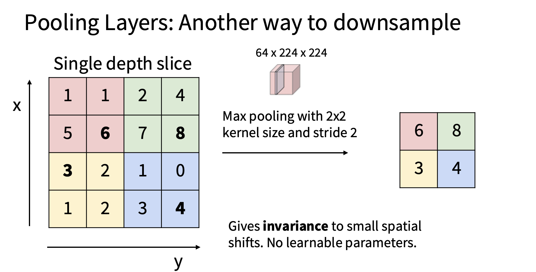 我们采用了几种不同的下采样机制,最常用的实际上是最大值,被称为最大池化,因此,在最大池化中,我们要做的是取单个深度切片,将其划分为不重叠的区域