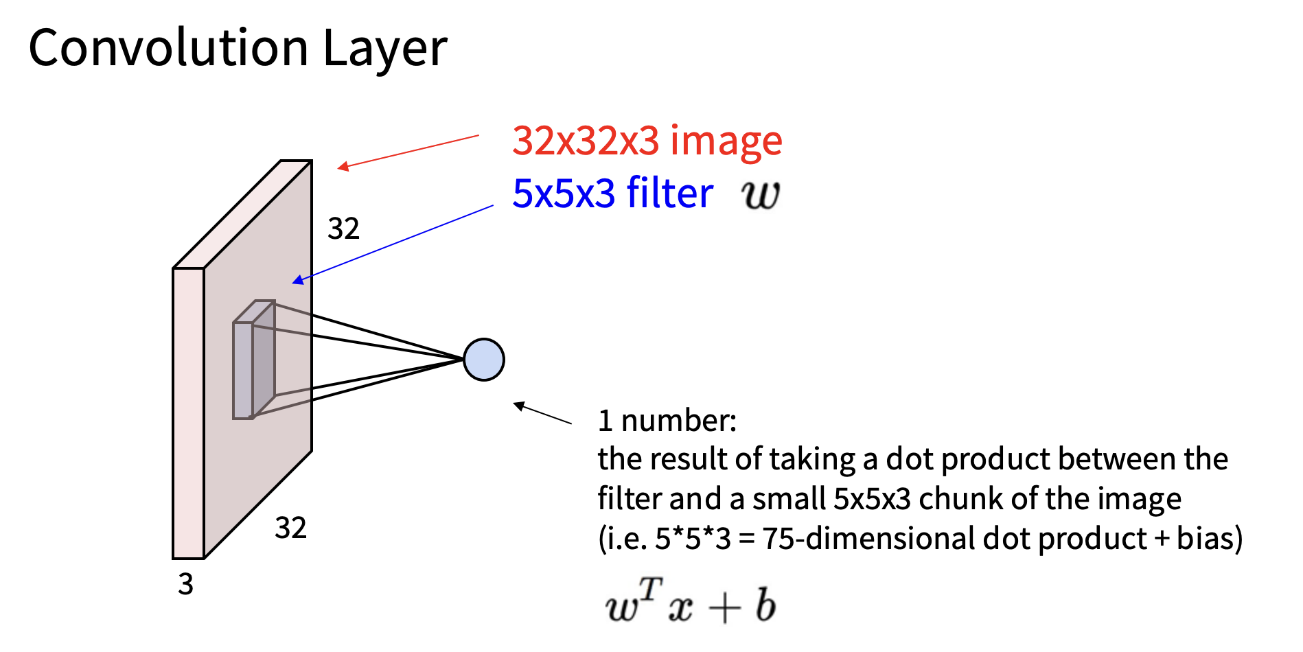 因此,如上图,我们将卷积滤波器放到图像的某个块上,这个5x5x3滤波器和该空间位置上的某个5x5x3的图像块对其,然后计算两者之间的内积,这将为我们提供一个标量数,告诉我们该图像块和模版的对齐程度