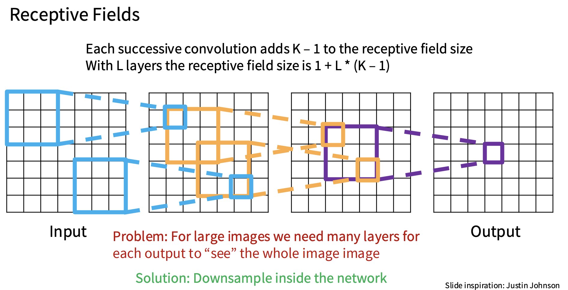 但是如果我们构建了一个将多个卷积堆叠在一起的ConvNet,如上图,这些感受野就会通过网络被放大,这里的每个条目都依赖于它之前一层的局部区域,因此,当有这些卷积时,即使每个单独的卷积都在查看它之前层中的局部邻域,当在多个层中堆叠卷积时,每个卷积所查看的原始输入的有效大小都会在网络的过程中增长,我们称之为有效感受野,所以卷积的有效感受野基本就是原始图像中有多少像素有机会影响下游网络的一次激活,这个有效感受野基本上随着卷积层的数量线性增长