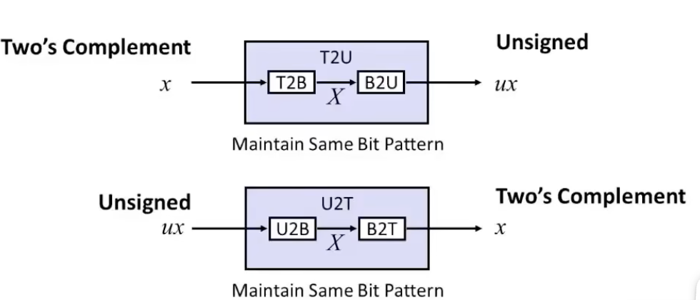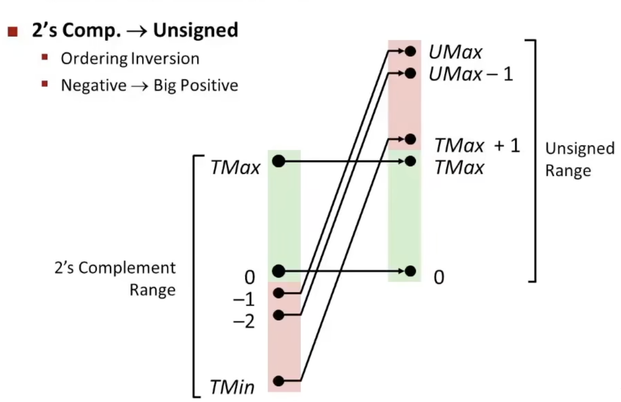 $$ U 2 T_{w}(u)=\left\{\begin{array}{ll} u, & u \leqslant \text{TMax} \\ u-2^{w}, & u>\text{TMax} \end{array}\right. $$下图为补码到无符号数的转换关系