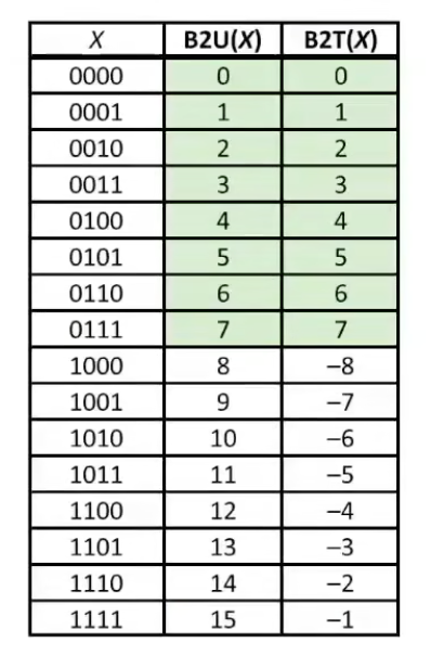 $B2T(X) = -x_{w-1} \cdot 2^{w-1} + \sum_{i=0}^{w-2} x_i \cdot 2^i$